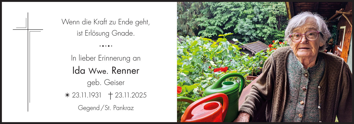 Entzünden Sie als Symbol der Ewigkeit eine Kerze, zum Gedenken an Ida Wwe. Renner geb. Geiser.