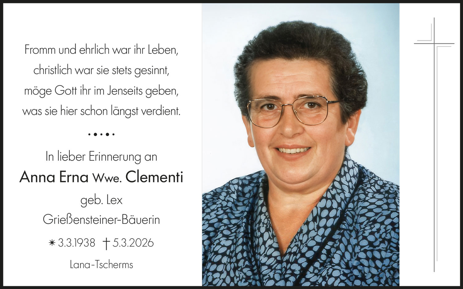 Entzünden Sie als Symbol der Ewigkeit eine Kerze, zum Gedenken an Anna Wwe. Clementi geb. Lex.