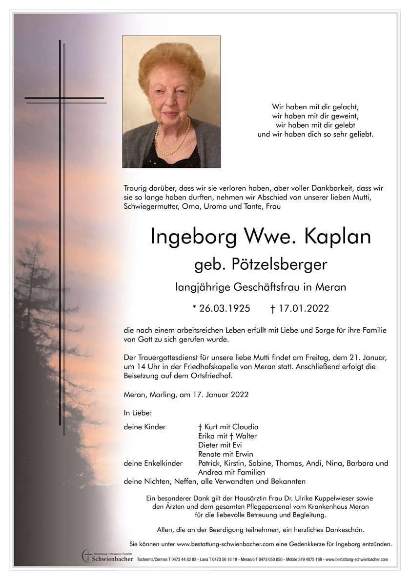 Ingeborg Wwe. Kaplan geb. Pötzelsberger