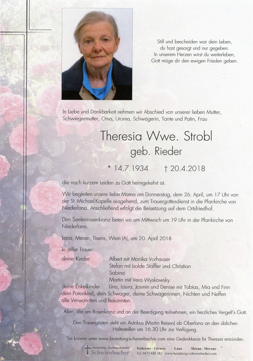 Accendete una candela come simbolo dell’eternità, per ricordare Theresia Wwe. Strobl geb. Rieder.