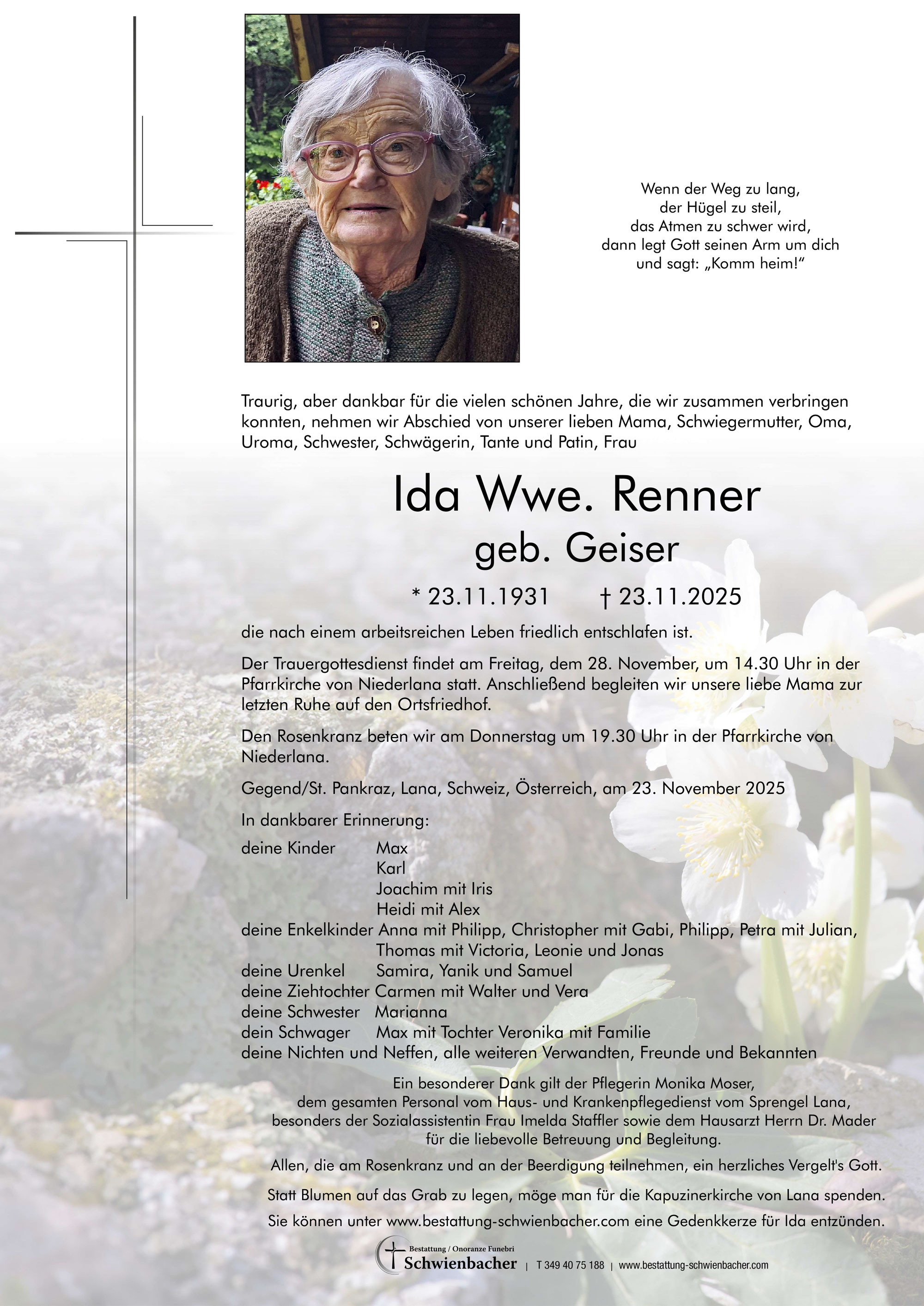 Accendete una candela come simbolo dell’eternità, per ricordare Ida Wwe. Renner geb. Geiser.